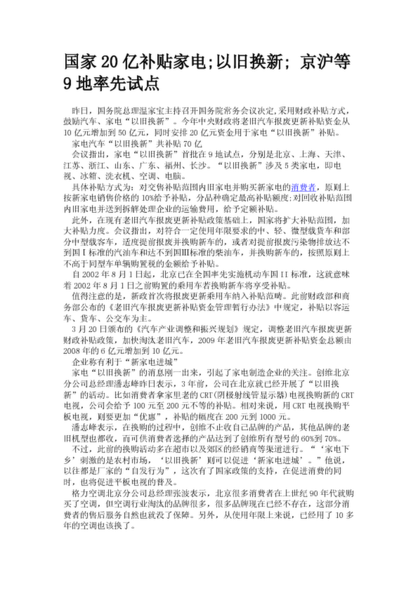 國(guó)家20億補(bǔ)貼家電"以舊換新" 京滬等9地率先試點(diǎn)