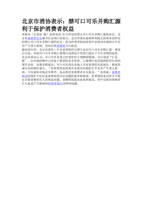 北京市消協(xié)表示:禁可口可樂并購匯源利于保護(hù)消費(fèi)者權(quán)益