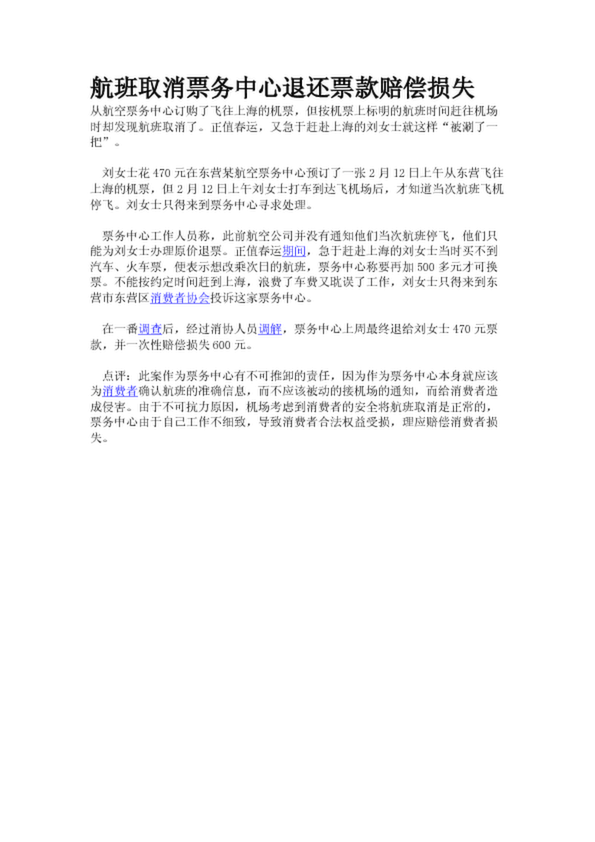 航班取消票務(wù)中心退還票款賠償損失
