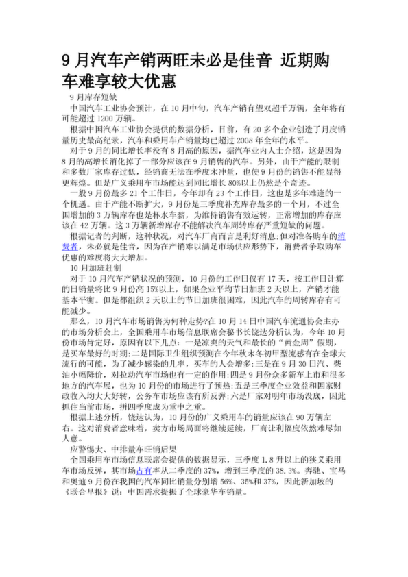9月汽車產(chǎn)銷兩旺未必是佳音 近期購車難享較大優(yōu)惠